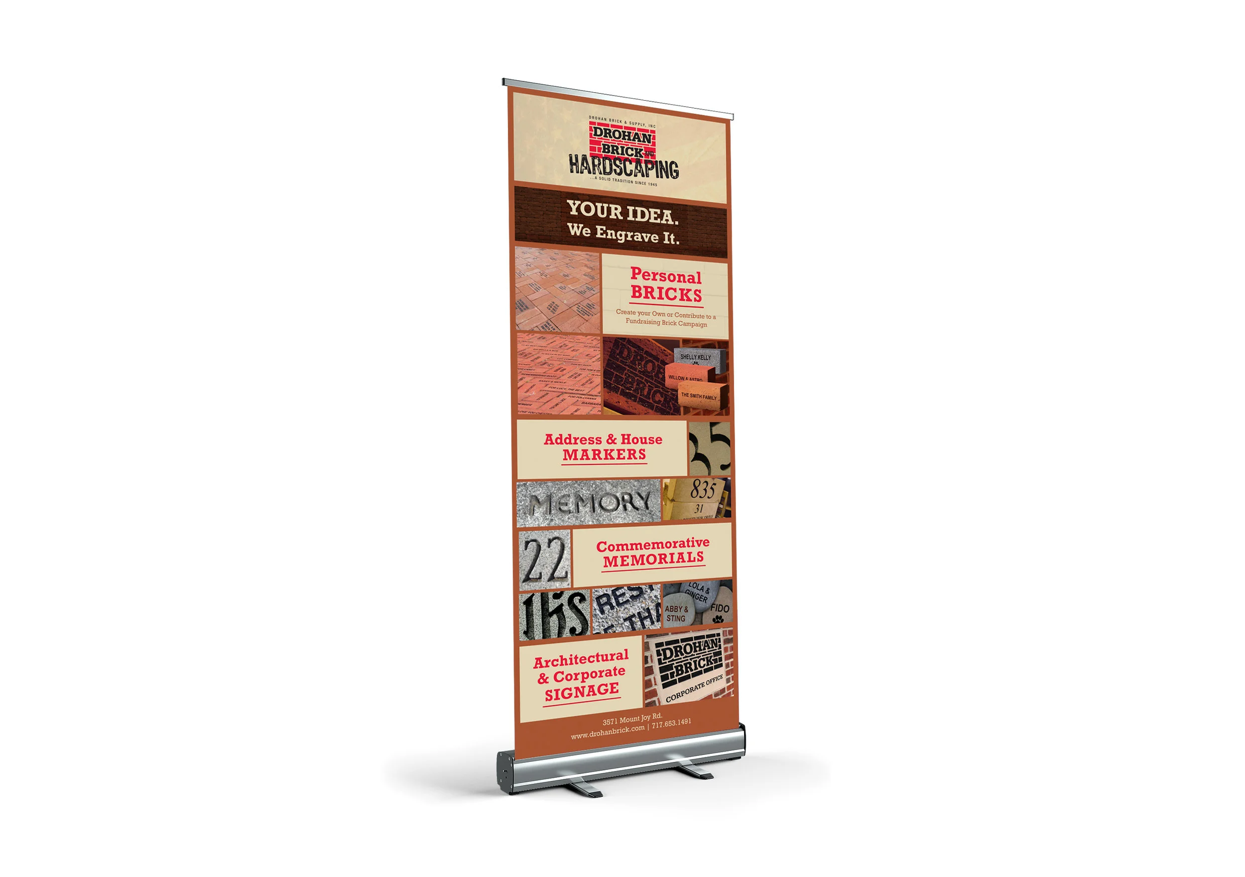 This multi-generational company has helped customers build beautiful patios, decks, driveways, pools, and more. Beyond the hardscaping projects, they also excel in custom engraving. In the six years I have worked with my agency for this client, we have produced signage, truck wraps, event materials, brochures, web work, t-shirts, advertisements, and anything else they dreamt up. My designs from this time are shown below.